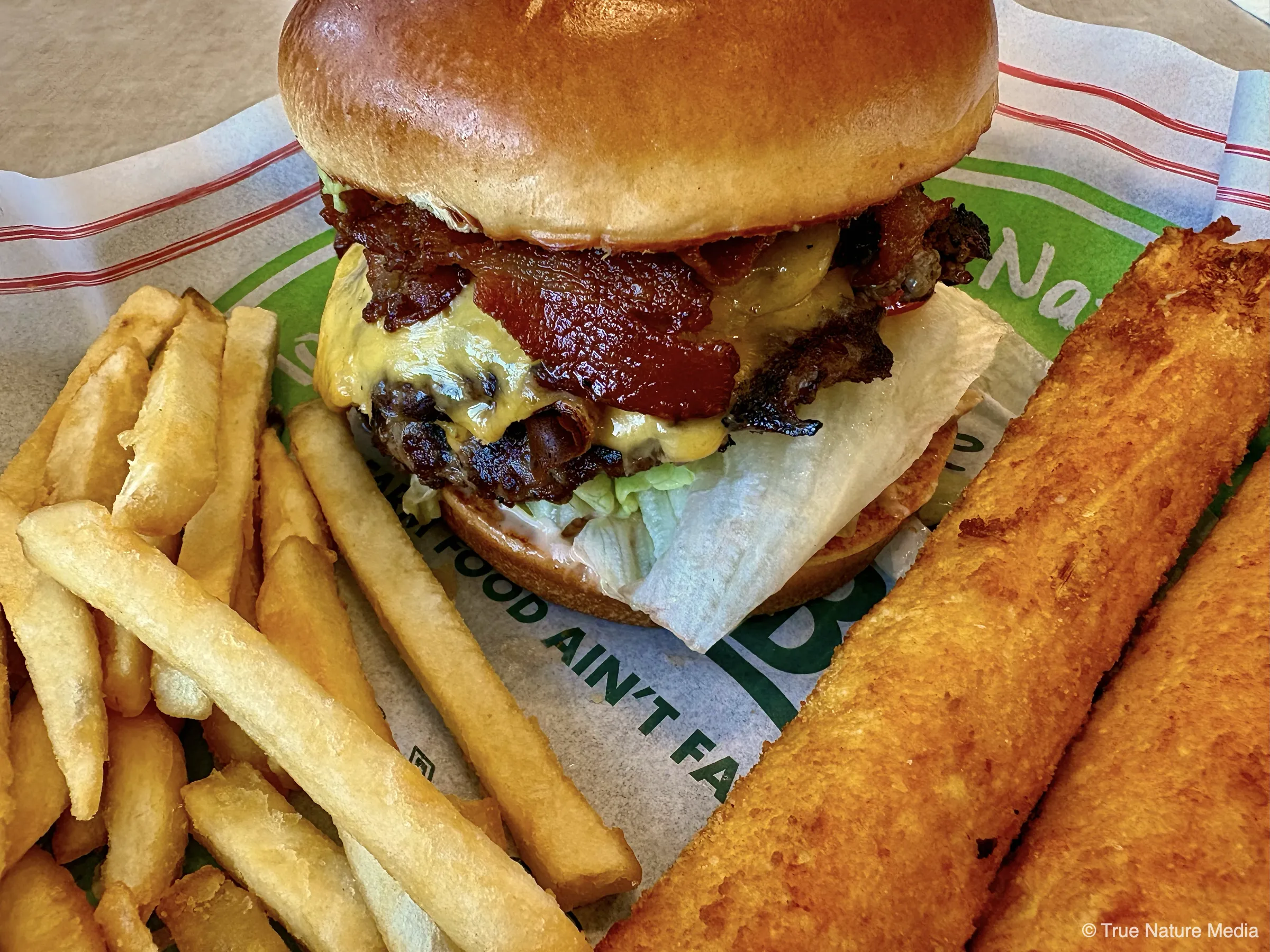 Expect to pay a little more than your typical fast-casual burger spot, around $18–$22 for a huge double-patty burger with fries and zucchini sticks, but the freshness, quality, and generous portions make it well worth it.